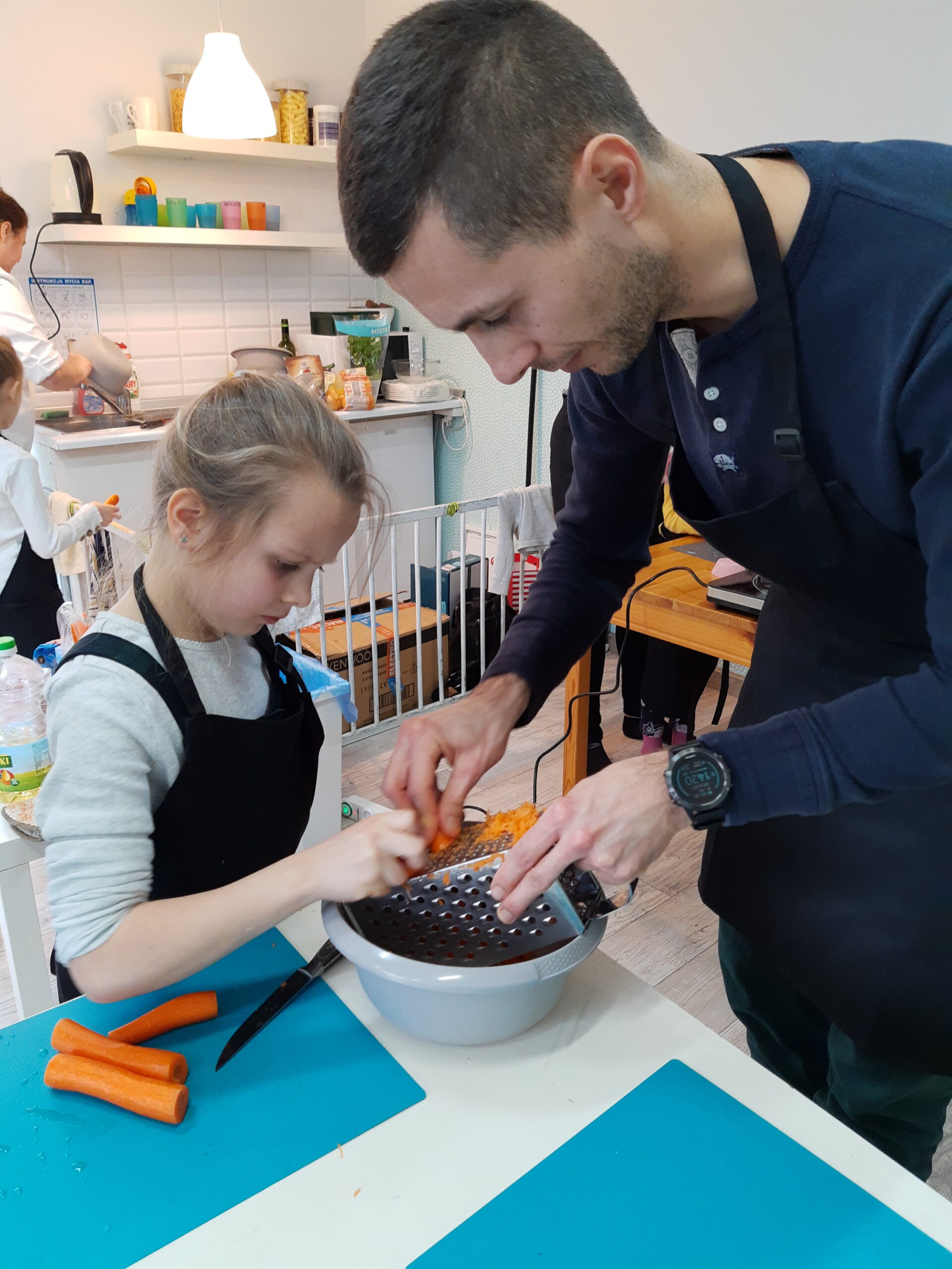 Tworzymy mini pizze, kolorowe pasty, muffinki pełne fantazji. Rozmawiamy o smakach świata, o tym, skąd bierze się jedzenie i jak można o nie dbać z szacunkiem. Każdy warsztat to mała przygoda, w której ważne są emocje, zapachy i wspólne gotowanie.